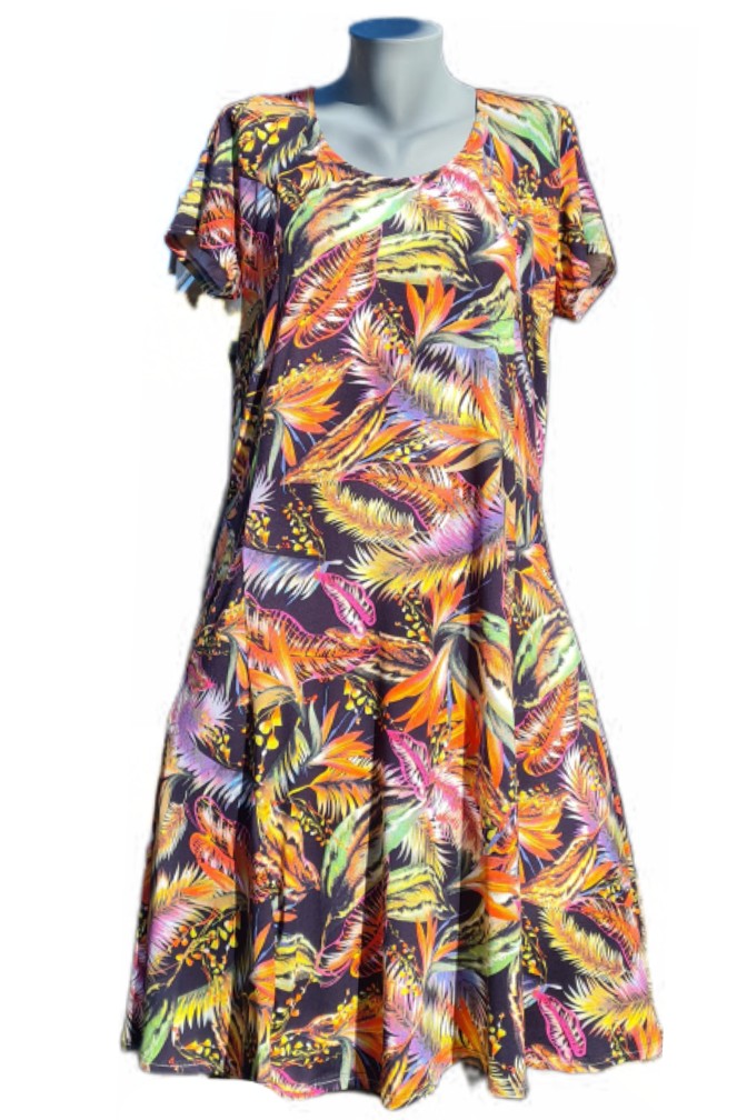 Jde o oblíbený letní princesový střih šatů s krátkým rukávem. Tyto šaty šijeme do velikosti 54. Délka šatů je cca 110cm