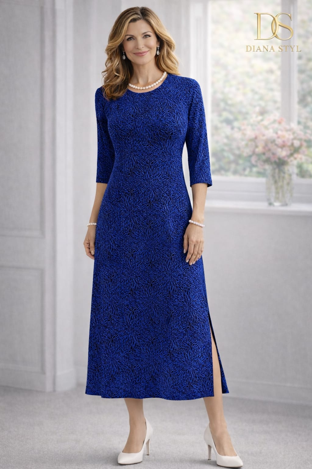 Šaty jsou z příjemného, splývavého materiálu s jemným třpytivým efektem. Decentní vzor v tmavě modrých tónech opticky zeštíhluje a dodává šatům slavnostnější nádech. Kulatý výstřih ,3/4 rukáv, rozparek na pravé straně zajišťují pohodlí.
